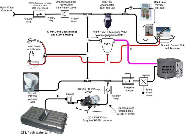 Fresh water flows from the 42-gallon tank via the water pump.